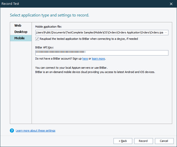 If you use BitBar as your mobile device cloud provider, upload the application file (Orders.ipa in our case) to your account file library. The easiest way to upload the file from TestComplete is to add it to your TestComplete project, for example, when you start test recording: