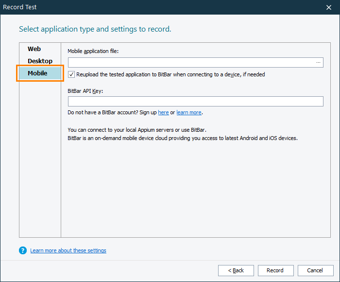 Leave the Reupload the tested application to BitBar when connecting to a device, if needed check box selected by default.