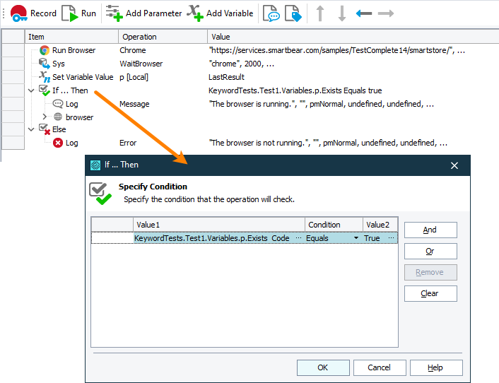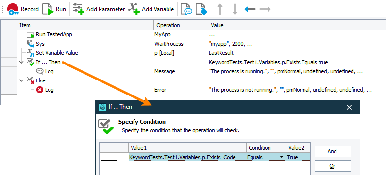 3. Add the If … Then operation to the keyword test and specify the condition to check: