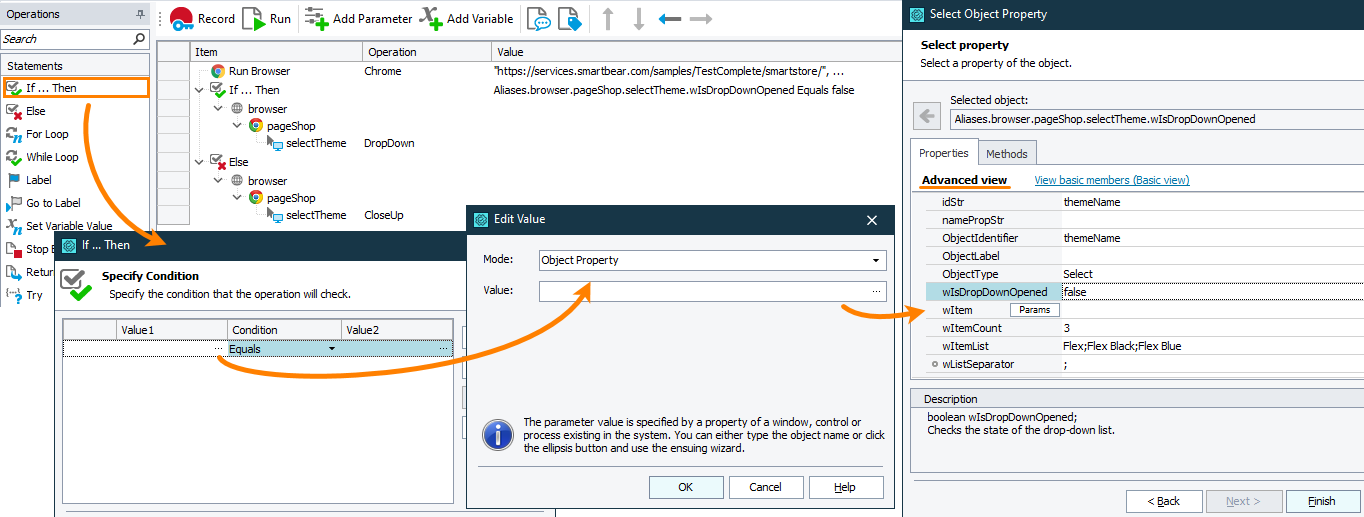 To specify operations to run if the check box has the expected state, add them as child items of the If … Then operation. For example, add the On-Screen Action operation as a child item of the If … Then operation and configure it to close the drop-down list if it is opened. Use the