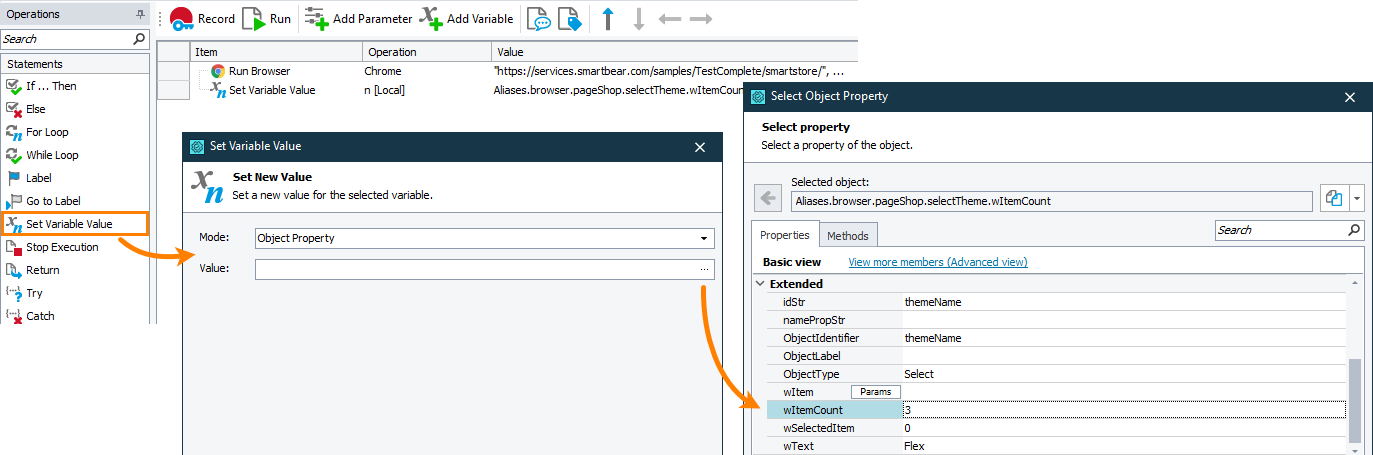 In your keyword test, add the Set Variable Value operation. TestComplete will open the Operation Parameter wizard.