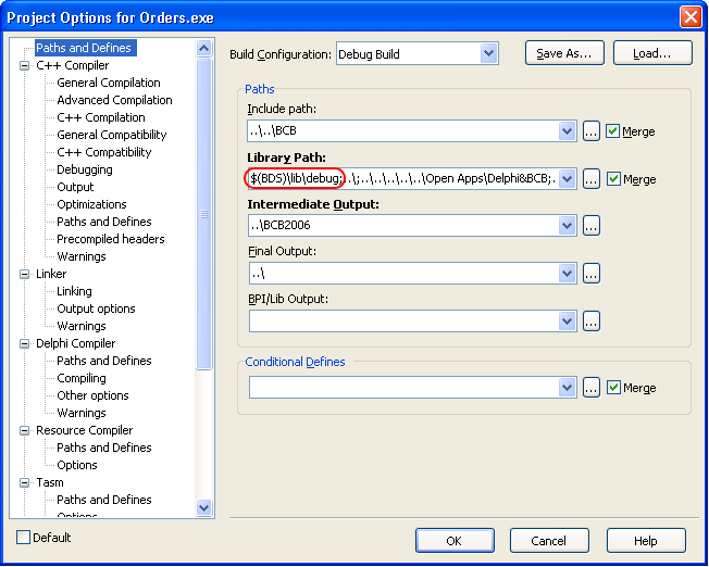 5. Switch to the Path and Defines category and examine the Library Path. If the path contains the $(BDS)\lib\release folder, replace it with $(BDS)\lib\debug:
