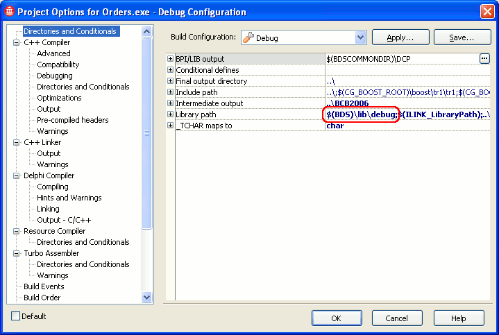Switch to the Directories and Conditionals category and examine the Library path. If the path contains the $(BDSLIB)\$(PLATFORM)\release or $(BDSLIB)\win32\release folder, replace it with $(BDSLIB)\$(PLATFORM)\debug or with $(BDSLIB)\win32\debug, respectively:
