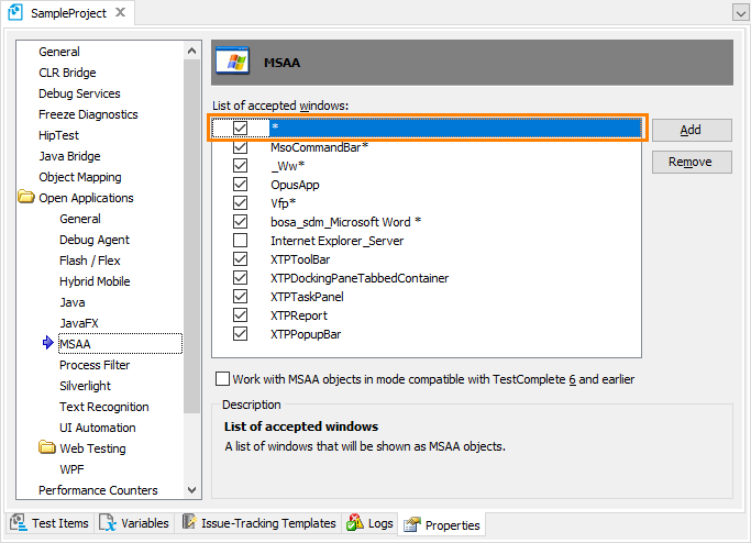 • Add class names (the WndClass property value) of your FoxPro application’s forms to the List of accepted windows. This will make the TestComplete MSAA engine expose individual controls in these forms.