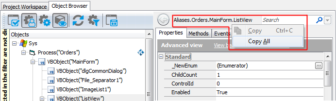 To refer to an individual object in the tested Visual Basic application, select the needed object in the Object Browser or Object Spy. These tools display the selected object’s name above the member list. From the right-click menu, you can copy this name to the clipboard and then insert it into your test.
