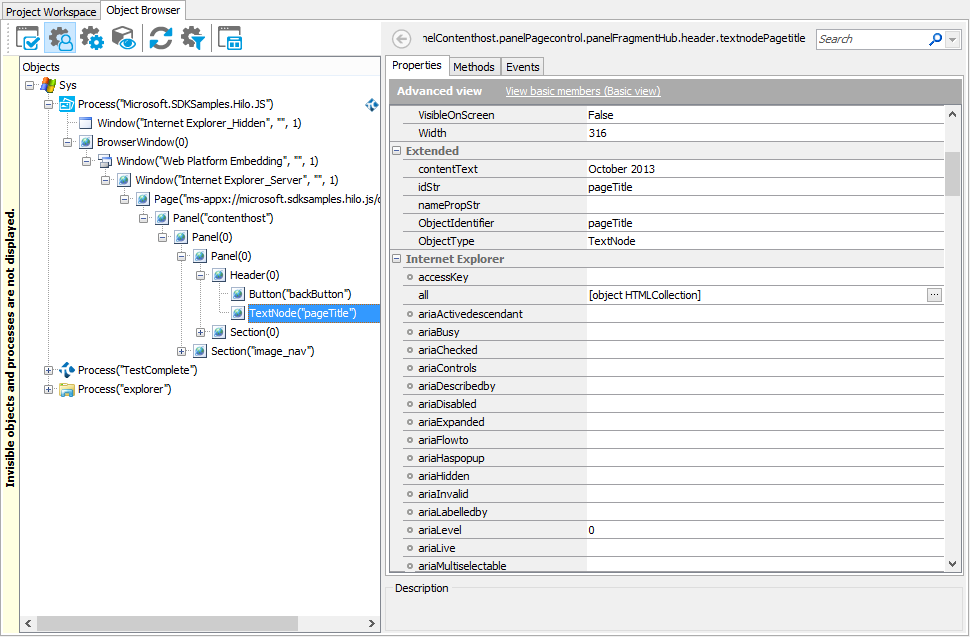 JavaScript-based Windows Store applications contain a built-in web browser window (Internet Explorer) that is used to display the application controls. The internal objects in these applications are recognized as web page elements of the appropriate type (image, link, button, edit box and so on). These objects contain methods and properties that TestComplete provides for test objects, plus methods and properties exposed by the built-in browser: