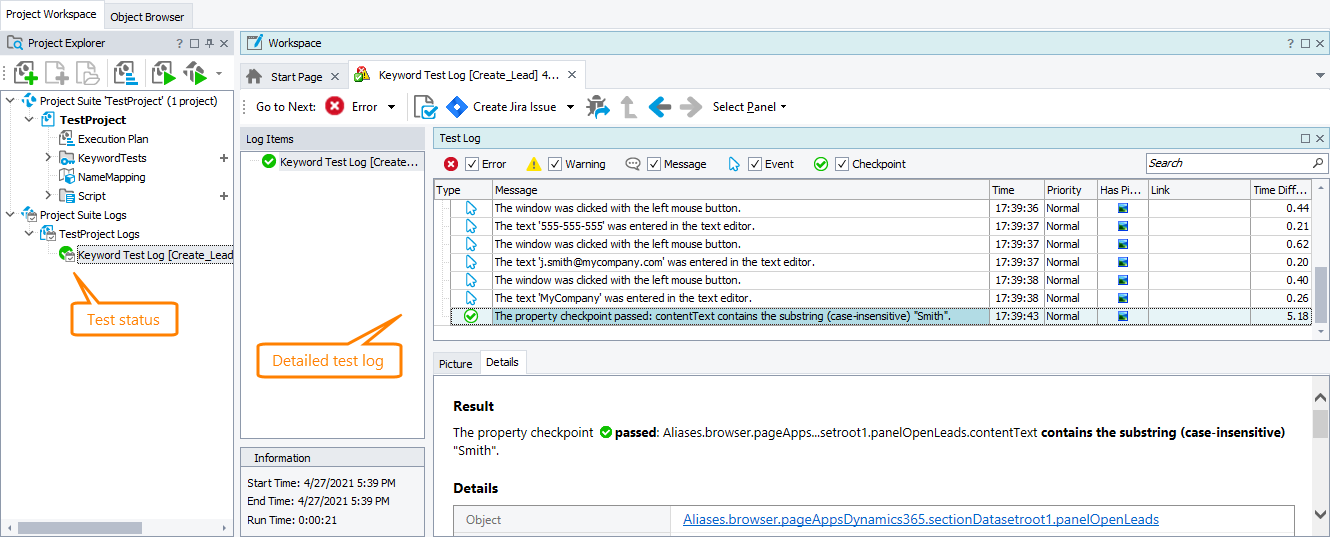 After the test run is over, you can view the results in TestComplete. The results include the overall test status (pass, fail, pass with warnings) and detailed data on each simulated user actions: