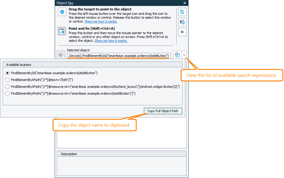 The easiest way to locate objects in your tested mobile application is to use the unique search expression that TestComplete provides for each object it recognizes in your tested mobile application. The Object Browser and Object Spy of TestComplete show the list of available search expressions (if several expressions are available):