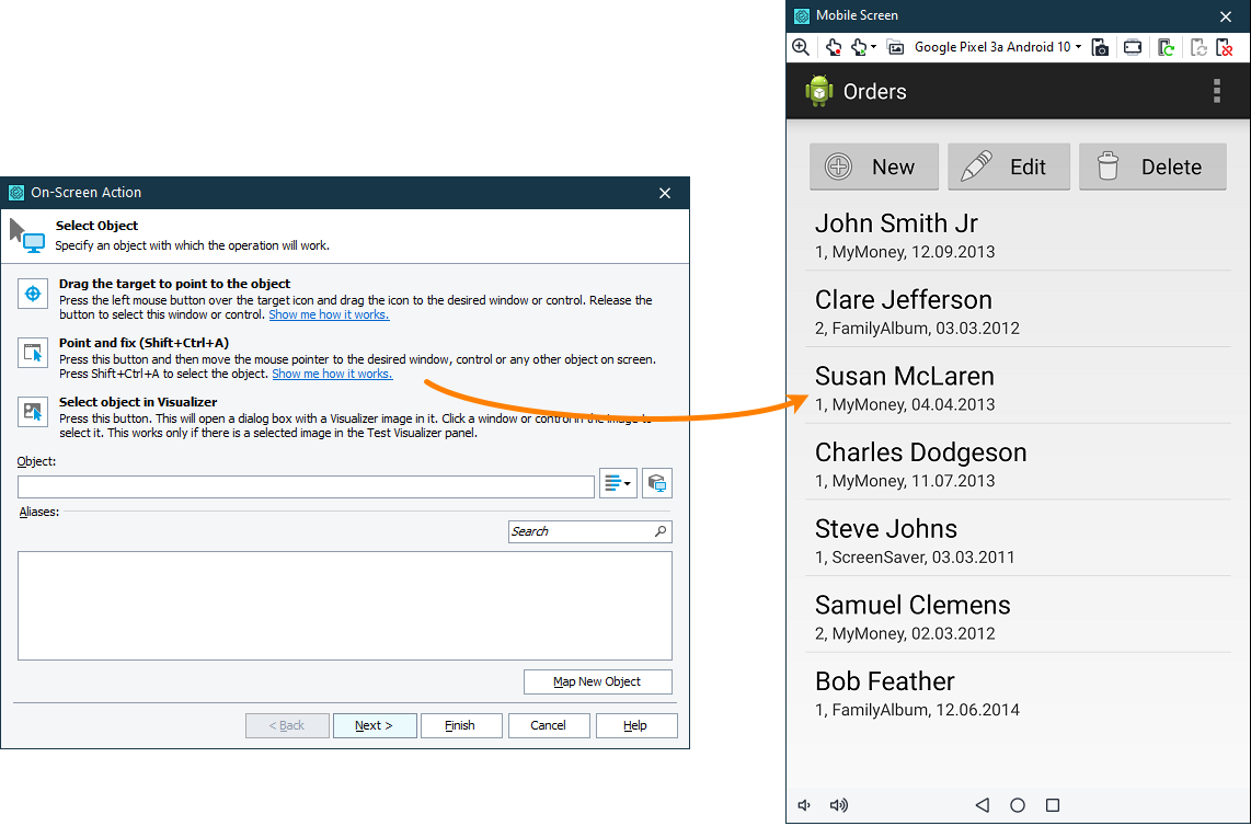 Locate the needed object in the tested application’s object hierarchy. You can do it either manually in the Object Browser, or by selecting the object visually in the Mobile Screen window with the Object Spy: