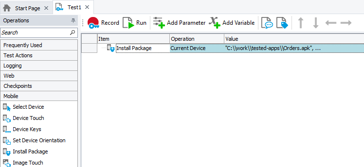 To install a package from keyword tests, use the Install Package operation. Note that you need to previously specify the device where to install the package using the Select Device or Device Loop operation.