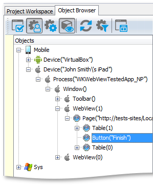 You can explore the object hierarchy of the tested hybrid applications in the Object Browser. Below is a sample object hierarchy of a hybrid application displayed in the Object Browser:
