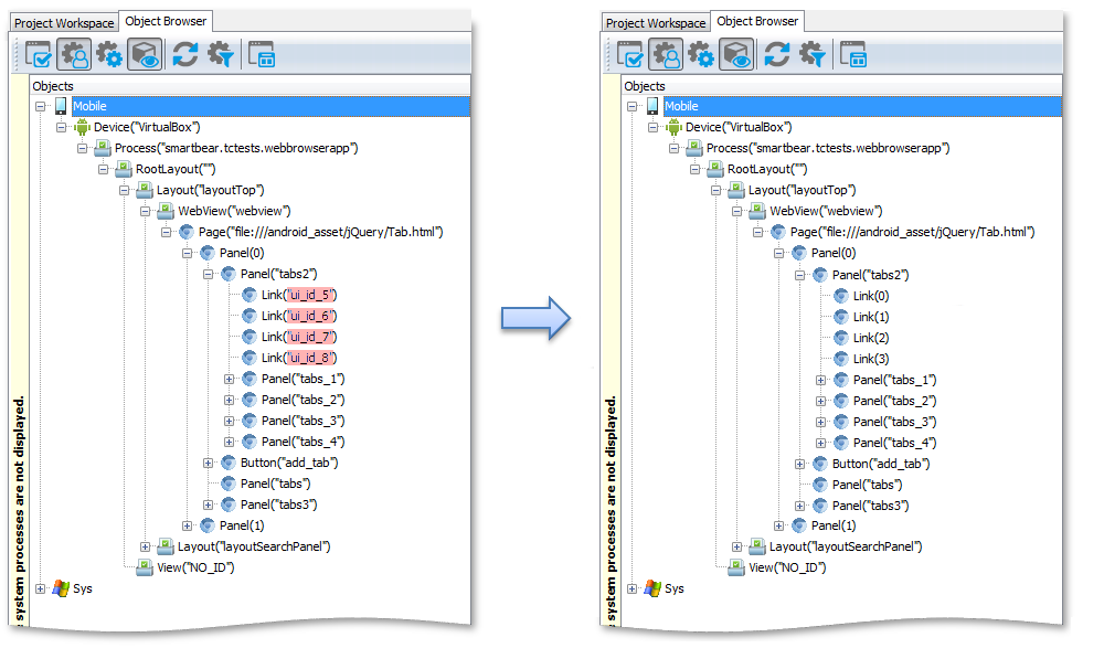 Some hybrid mobile applications generate dynamic IDs for web page elements: buttons, input fields and so on. Dynamic IDs usually include auto-incremented numbers, for example, ext-gen-123, treepicker-1038-inputEl, view:_id1:_id2:content. These numbers can change from session to session or from one application version to another, which creates difficulties for object identification. To ensure robust automated web testing, an automated testing tool should be able to reliably identify objects even if they have dynamic IDs.