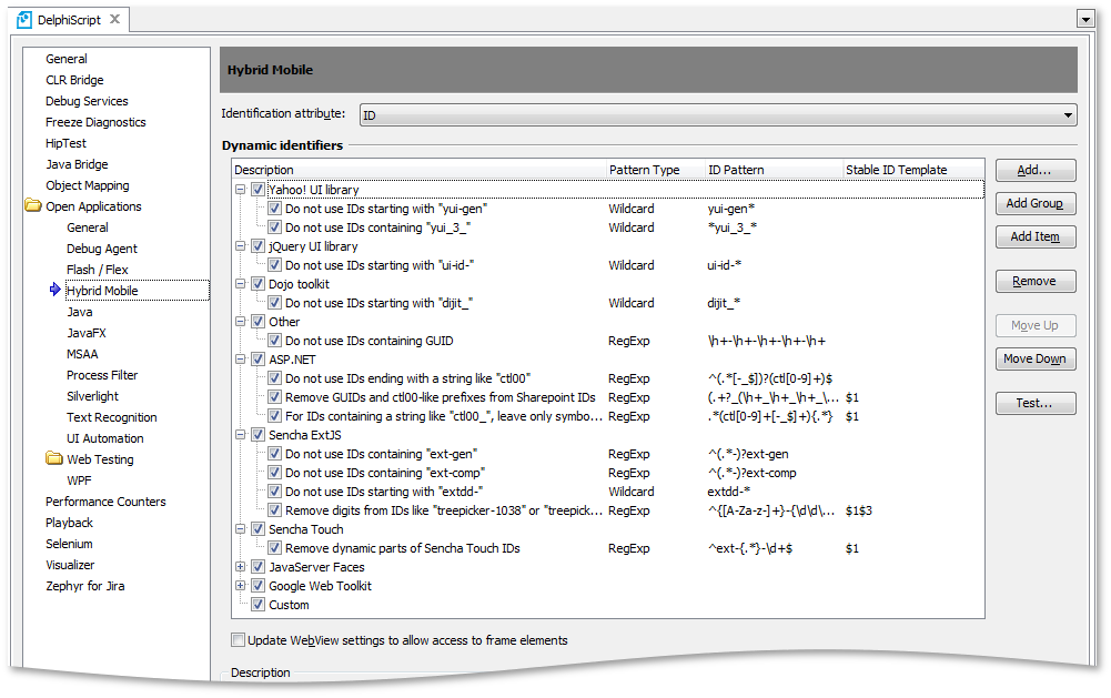 You can view and manage dynamic identifier patterns in the Open Applications | Hybrid Mobile options of your test project. The patterns can use wildcards and regular expressions. By default, each project has built-in patterns for popular web application frameworks, such as: