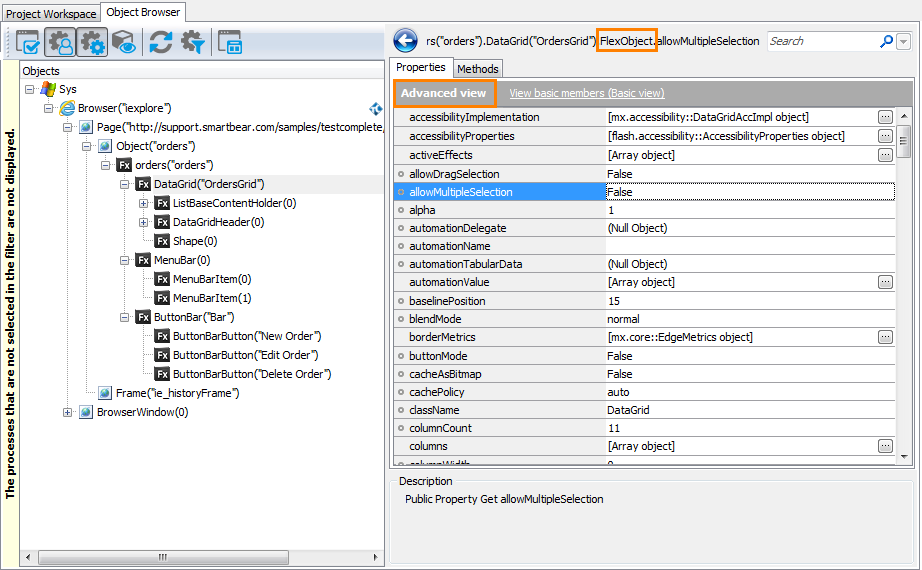 The Object Browser marks objects of Flash and Flex applications with the glyph. To view native properties and methods available for a Flash or Flex object, use the Object Spy or Object Browser in the Advanced view mode. TestComplete gives you access to public properties and methods via the FlexObject property (see Important Notes for details).