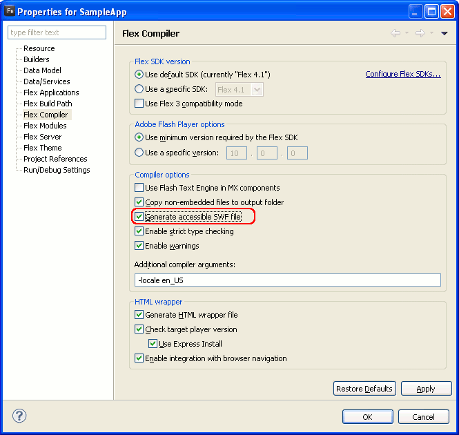 Select the Flex Compiler category and enable the Generate accessible SWF file option: