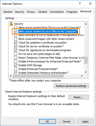 • If you test web pages stored on the local computer in Internet Explorer 11, check Allow active content to run in files on My Computer: