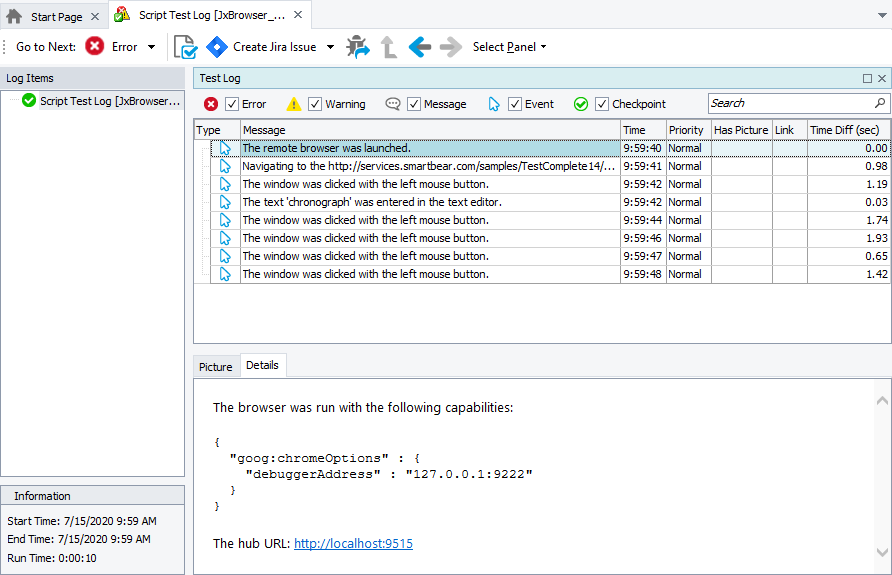 TestComplete will connect to JxBrowser via ChromeDriver and simulate user actions in it. After the test run is over, you can view the test results: