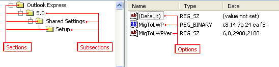 This object has a mechanism that allows you to work with sections and options stored in the system registry, INI, XML and binary files. To illustrate what sections and options are, let’s have a look at the registry: