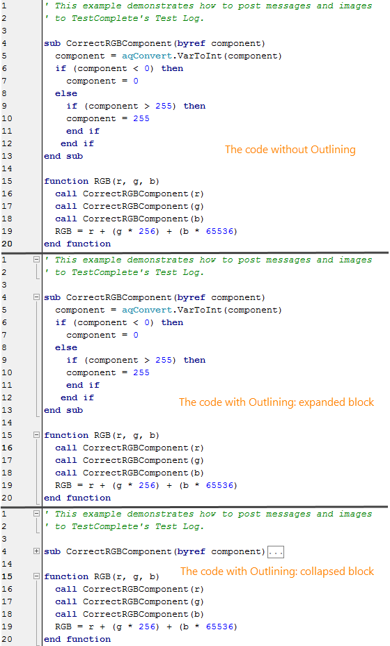 By default, TestComplete automatically combines routines and multi-line comments into blocks, which you can then expand or collapse. You can disable automatic outlining and manually define outlining of any code fragments.