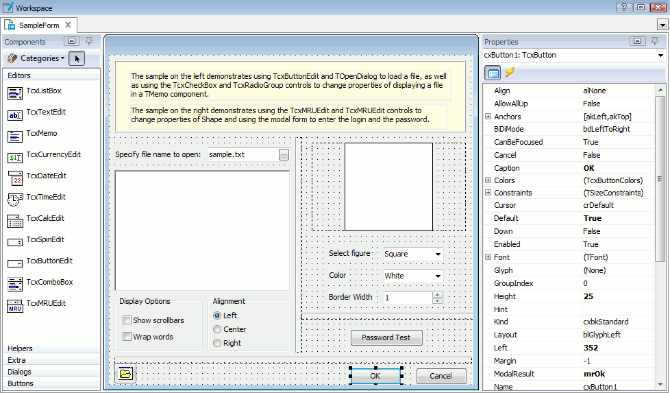 The Properties page lets you view and change the component properties. Each component has various properties that let you configure the component size, appearance, behavior and so on. If a component’s property is an object, the property value cell displays the object class in the parenthesis, for example, “(TcxButtonColors)”. If this object has child properties, you can view them by expanding the parent property’s node.