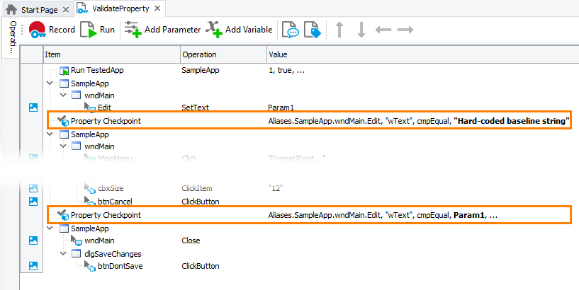 The image below demonstrates two Property Checkpoint operations. One of them checks the tested object’s property against the hard-coded string value, the other one — against the value stored in keyword test parameter Param1.