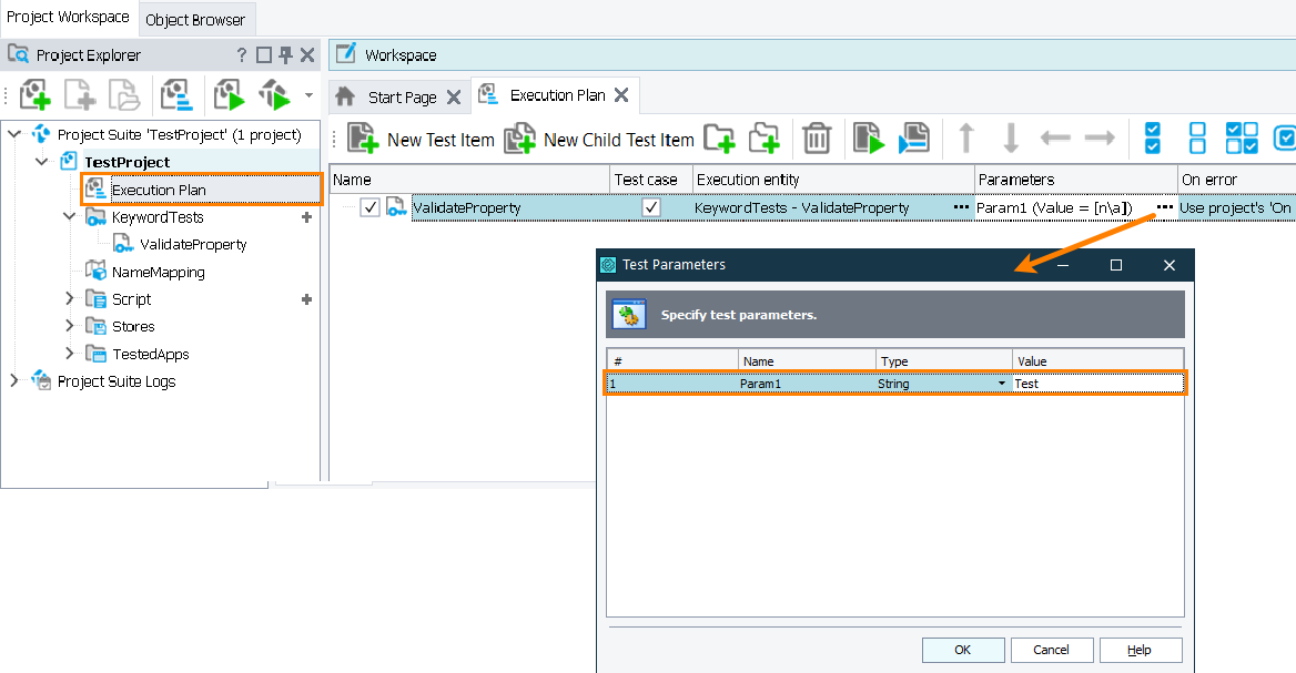 • If you run it as part of the project’s test items sequence, set the test parameter in the Execution Plan editor of your project: