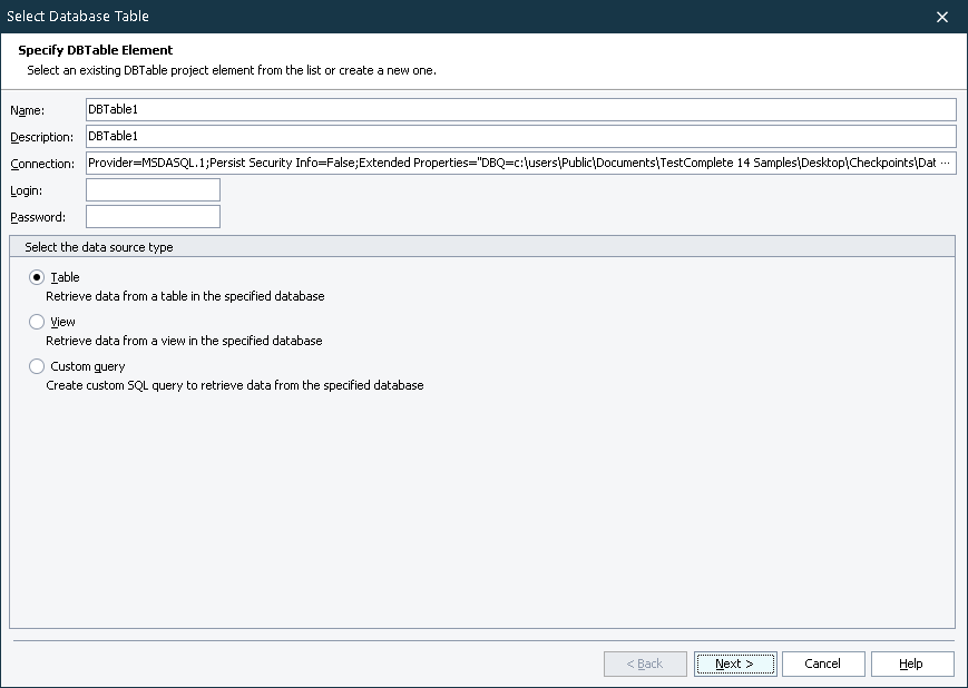 Table - TestComplete will retrieve data from a database’s table (you will be able to specify the desired table on the next page of the wizard).