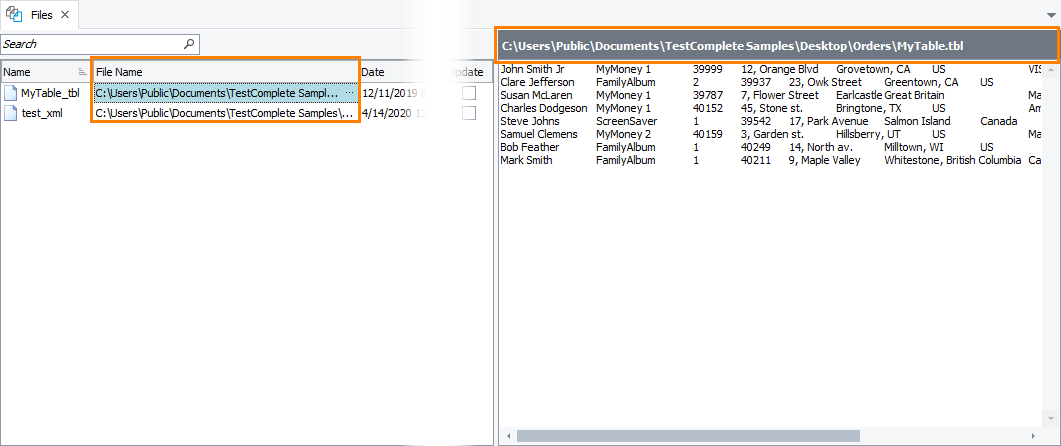 The Stores > Files collection of your TestComplete project stores files used for file comparison during testing. For example, you can compare a stored file with an actual file to check whether the actual file contains the appropriate data.