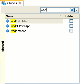 Since the Objects collection can contain a great number of elements, searching for a certain element can be quite inconvenient. The Quick Search edit box at the top of the editor allows filtering elements of the Objects collection by their names.