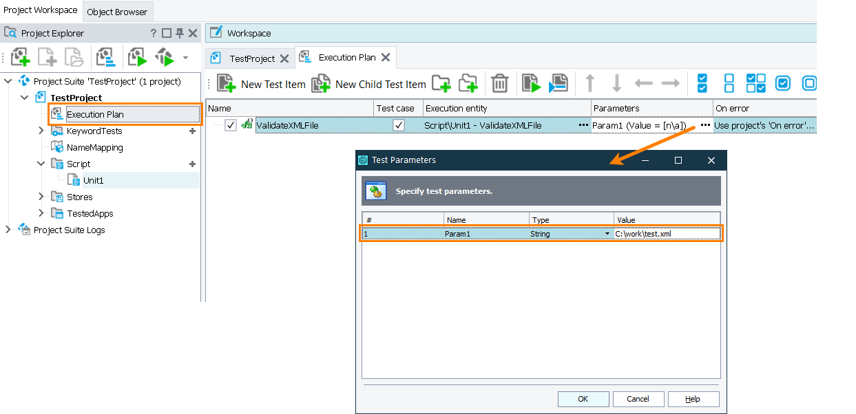 • If you run it as part of the project’s test items sequence, set the test parameter in the Execution Plan editor of your project: