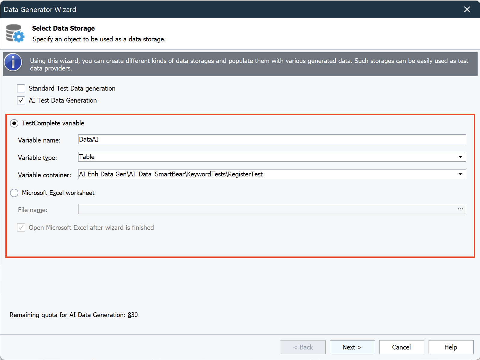 Note: If no project suite is open in TestComplete, you can't save the generated data to a variable. In this case, you can only save the data to an Excel file.
