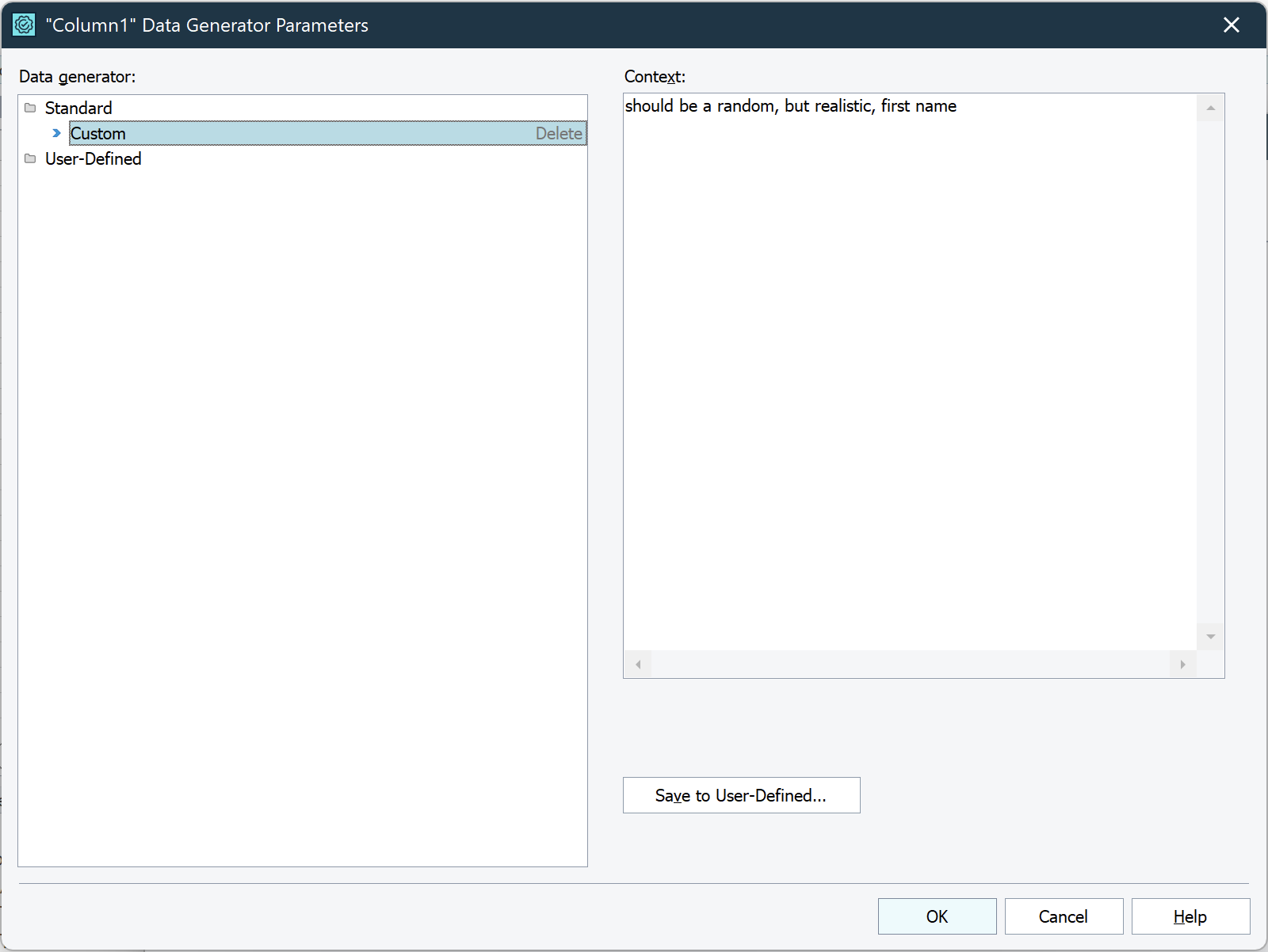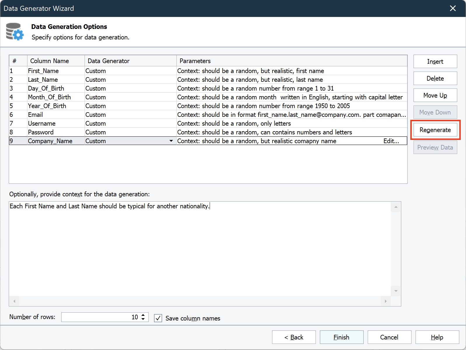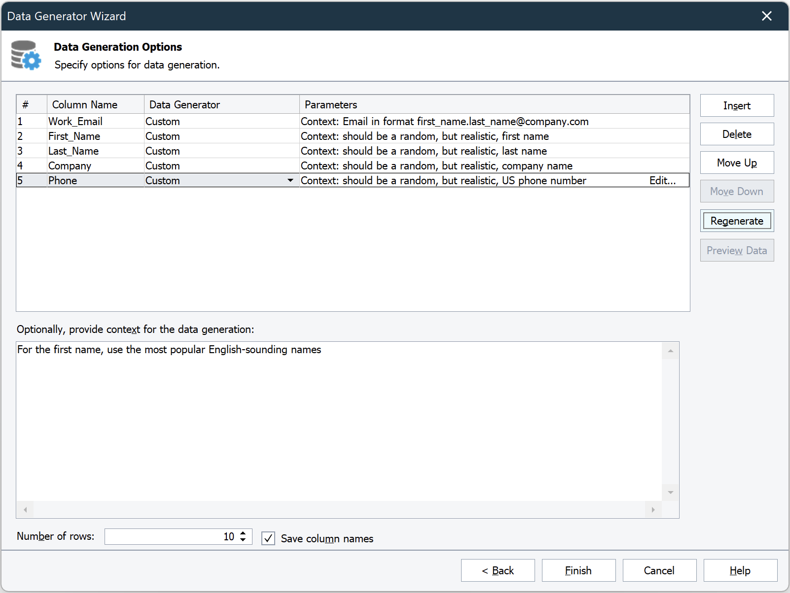Parameters - Specifies additional context for the selected data generator. To modify context for each field, click within the Parameters cell to activate the in-place editor, and press the Edit button. Once you’ve done it, a window will open with a Context field. You can use natural language to describe what the data in a given column should look like.