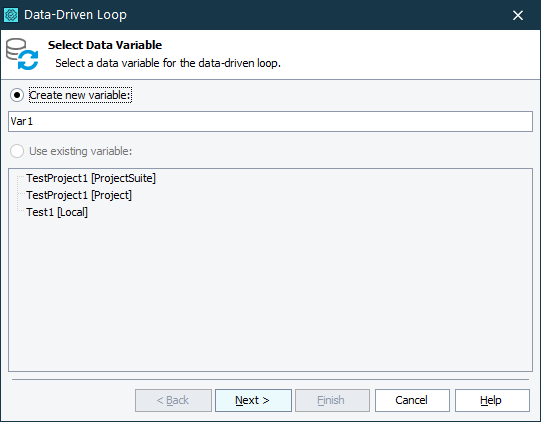 On the first page of the wizard, you can specify either a new DB Table variable that will get records of the needed data storage or an existing one. To create a new variable, choose the Create new variable option button and specify the variable’s name.