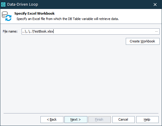 In the dialog, select the Excel file that stores the test data. In one of the previous steps, we said that we would use the TestBook.xlsx file. You can find it in the <Users>\Public\Public Documents\TestComplete 15 Samples\Common\Data-Driven Testing\ folder.