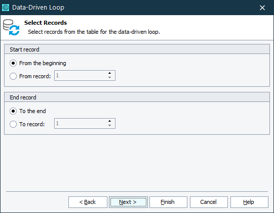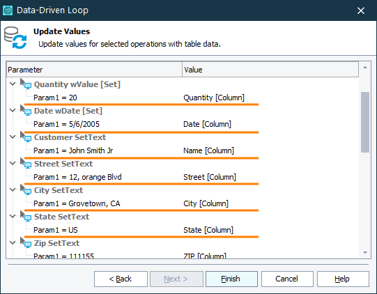 After you click Finish, TestComplete will add the Data-Driven Loop operation to the recorded test and move the selected operations as its child operations. Also, it will update the parameters of the moved operations with the values specified in the Data-Driven Loop wizard.