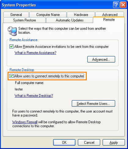 • Select the Allow users to connect remotely to this computer check box (or similar).