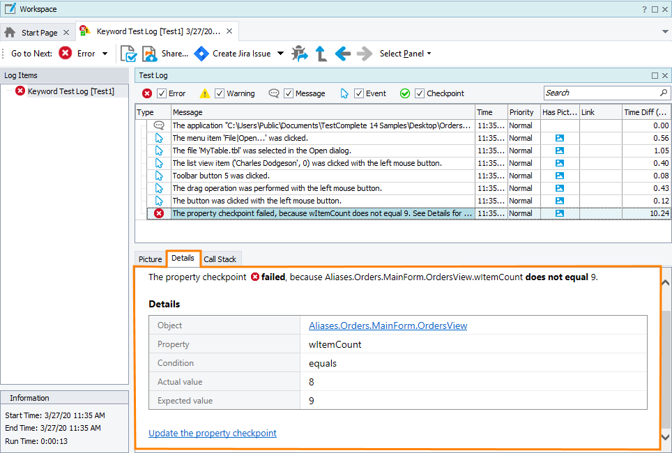 Generic Test Log - Details Panel