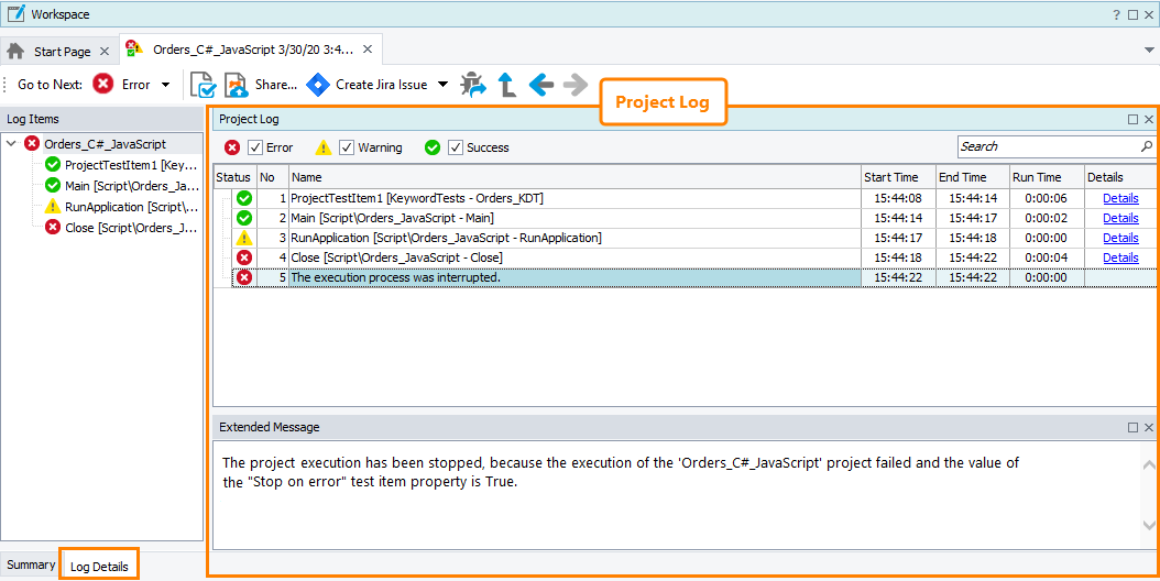 To filter the log contents so that you can view test items with a specific status only, select or unselect check boxes at the top of the log. For example, select the Error check box and clear the other check boxes to view only failed test items. In the image below, you can see a project log that shows only failed test items: