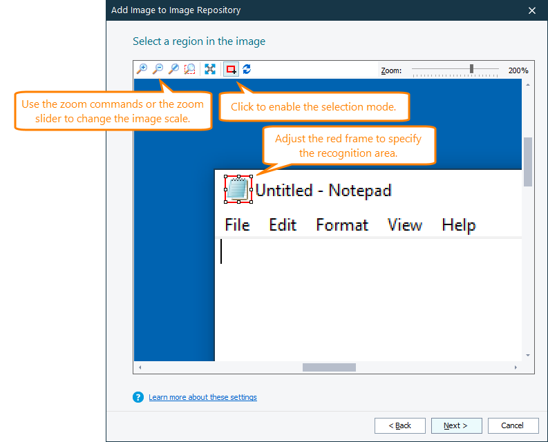 Adjust the red frame to specify the needed recognition area. In our case, it is the icon in the top-left corner of the window caption: