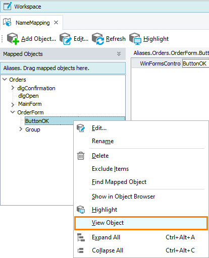 Right-click the object in the Name Mapping repository and select View Object from the context menu: