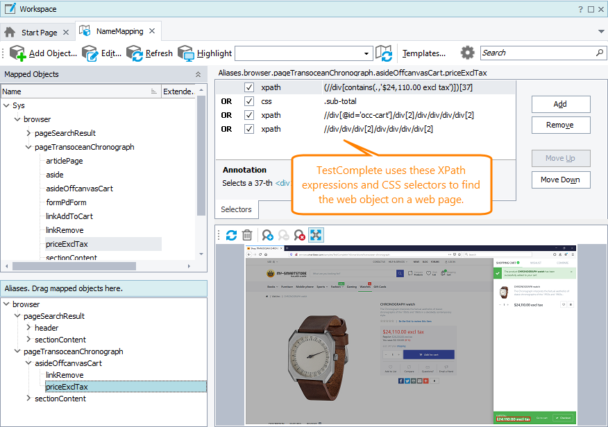 For web applications, a selector can be an XPath expression or a CSS selector. You can view the selector type in the appropriate column in the Name Mapping editor.