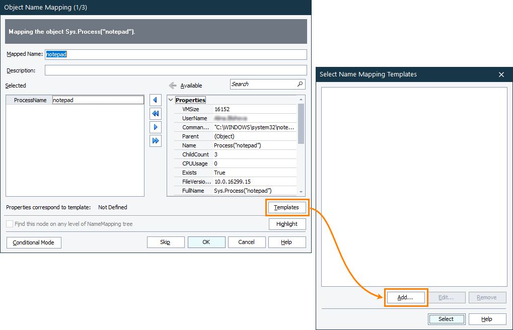 TestComplete will then show the Object Name Mapping dialog for each object to be mapped. Click Templates in this dialog to view the list of available templates: