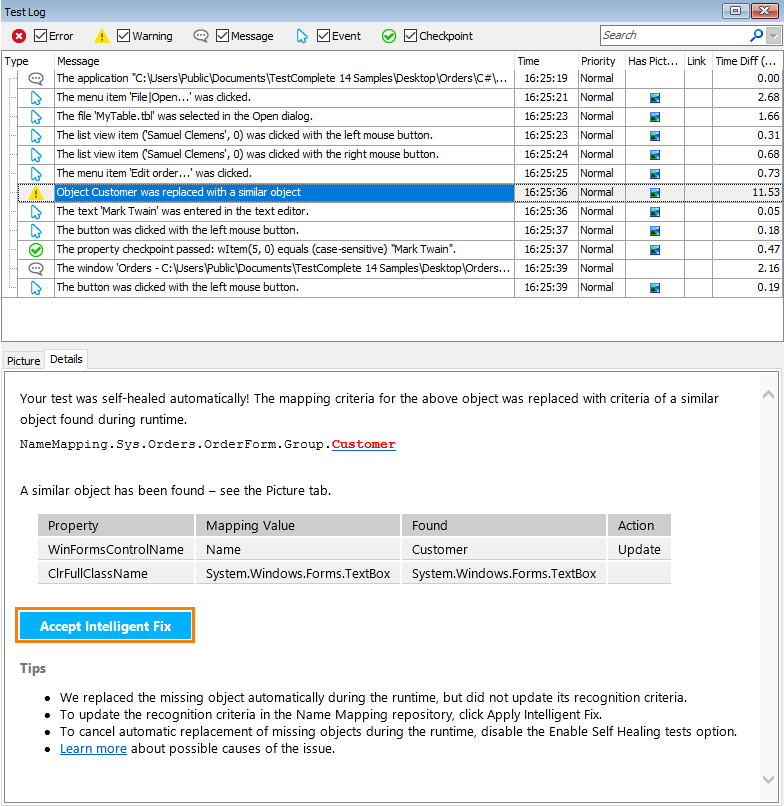 If a similar object is found, TestComplete will simulate the user actions over it and continue running the test. It will post this warning message suggesting that you update the tested object’s recognition criteria to match the found object: