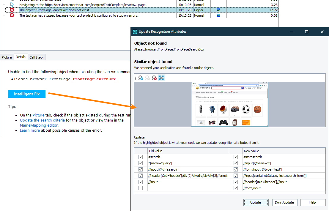 • One of the possible reasons why the search fails is that the recognition attributes of the needed object have changed. To help you solve this problem, TestComplete automatically searches for objects that are similar to the missing object.