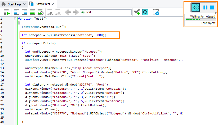 time-consuming operations, such as waiting for an application response, delaying test run, waiting for object state changes and operations whose run time is known in advance, TestComplete displays text and a progress bar in a balloon near the