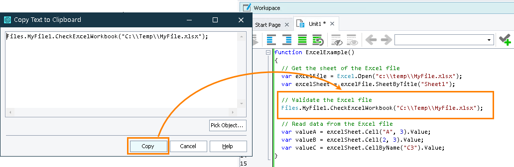 If you are creating an Excel checkpoint while editing a test script, then the generated checkpoint code will be displayed in the Copy Text to Clipboard dialog. You will be able to copy this code to the clipboard and then paste it to the desired place in your script: