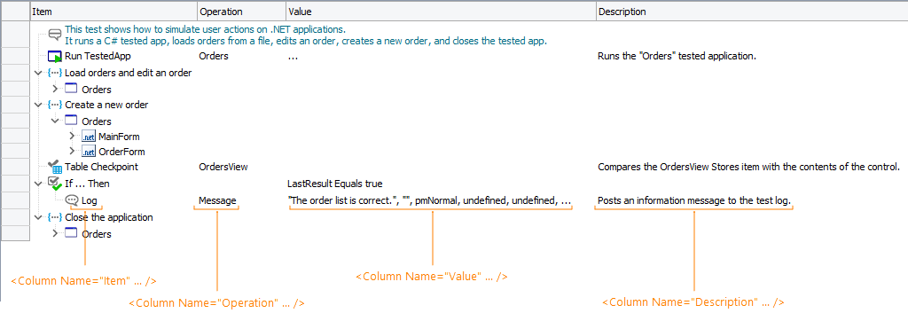 Tip: To display the list of operation parameters in the Value column, set the EditorType attribute of the corresponding Column element to Parameters, instead of using the Value or GetValue attributes. In this case, the Keyword Test editor will manage the contents of the Value column itself. For more information, see Implementing In-Place Editing Support.