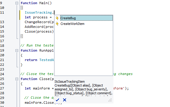 Templates you create in the Template editor will appear in the Code Completion window as a method of the IssueTracking object; template fields are shown as method parameters: