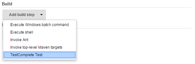 1. In the Build section, click Add build step and choose TestComplete Test from the drop-down list: