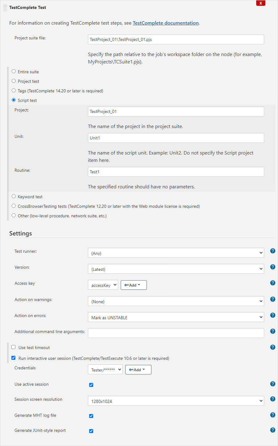 • Generate MHT log file - If this option is enabled, TestComplete exports test results to a .mht file after the build is over. You can download this file from the Jenkins page displaying test results.